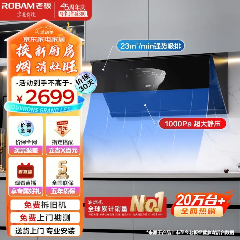 老板(Robam)抽油烟机家用大吸力 变频三面拢23风量低噪一级能效吸油烟机侧吸式脱排油烟机28D3S价格:2699.00元!
