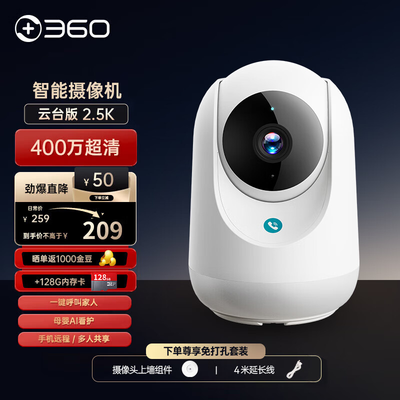 360 摄像头家用监控智能摄像机7P 2.5K云台版400万网络wifi微光全彩夜视双向通话度旋转 【尊享大内存】7P标配+128G内存卡价格:329.00元!