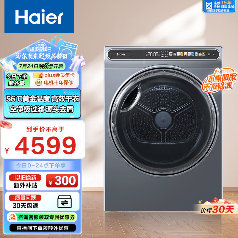 海尔(Haier)晶彩烘干机家用 10公斤热泵干衣机?空净过滤 羊毛柔烘 除菌净螨 专业护衣 EHG100MATE59以旧换新价格:4599.00元!