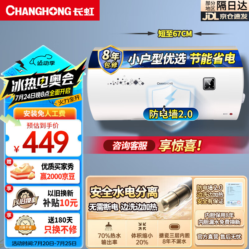 长虹(CHANGHONG)50升电热水器家用五倍增容2.2KW大功率速热节能保温小巧易操控抗腐耐用双重防漏电Y50J01价格:469.00元!