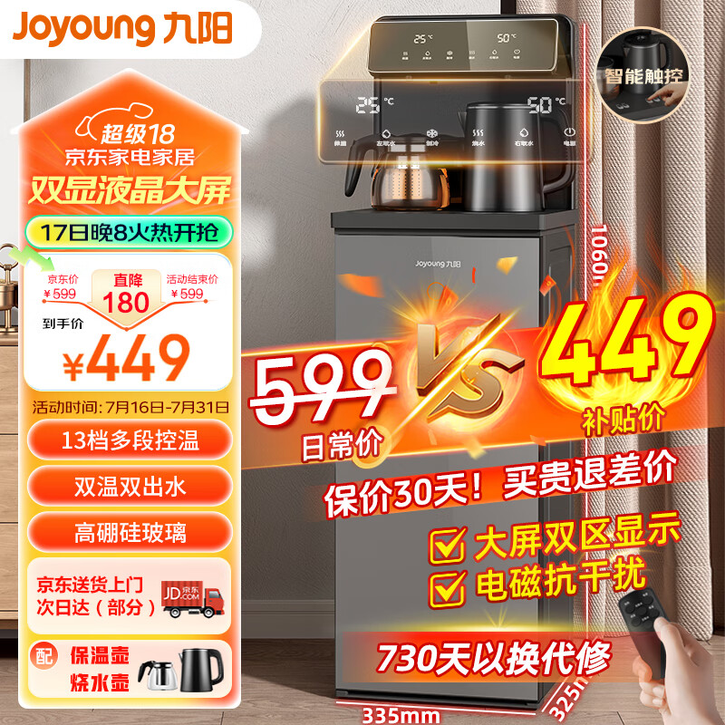 九阳(Joyoung)家用茶吧机大屏下置水桶饮水机 双温双显双出水口 立式智能茶吧机 冷热款 【月石灰】价格:459.00元!