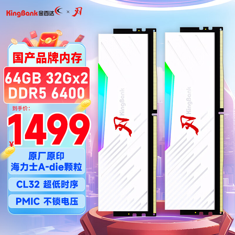金百达(KINGBANK)64GB(32GBX2)套装 DDR5 6400 台式机内存条海力士A-die颗粒 白刃RGB灯条 C32价格:1499.00元!