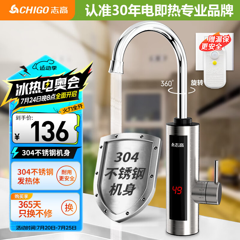 志高(CHIGO)不锈钢电热水龙头 快热加热水小厨宝 即热式电热水器 速热水龙头 赠漏保 下进水ZG-ZS821-2B-H41X价格:138.00元!