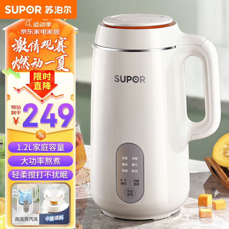 苏泊尔(SUPOR) 豆浆机 1.2L家用大容量多功能全自动破壁免滤可预约高温洗破壁机早餐机 DJ12B-P29E价格:249.00元!