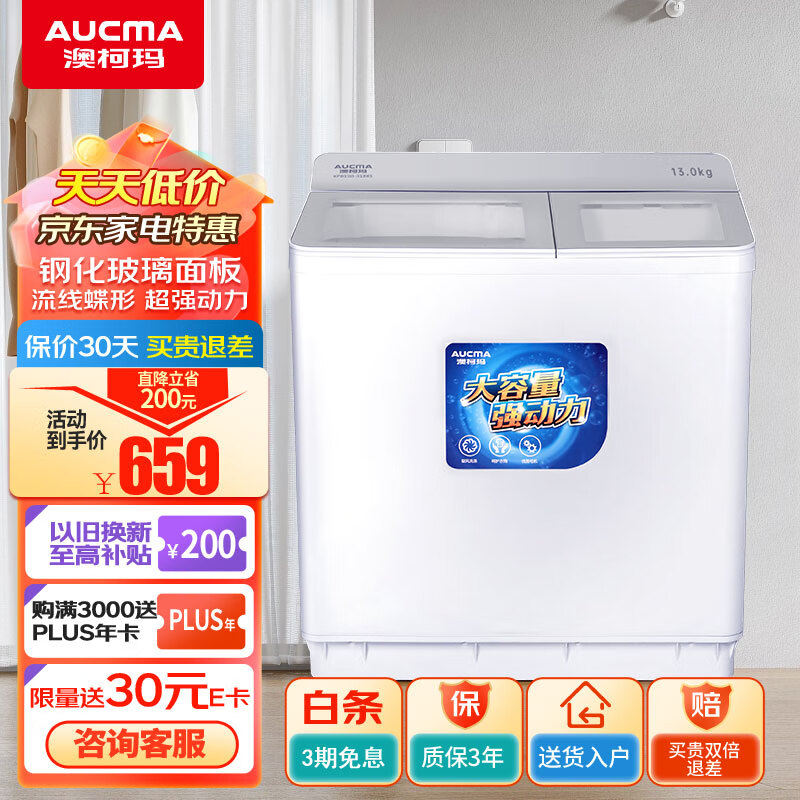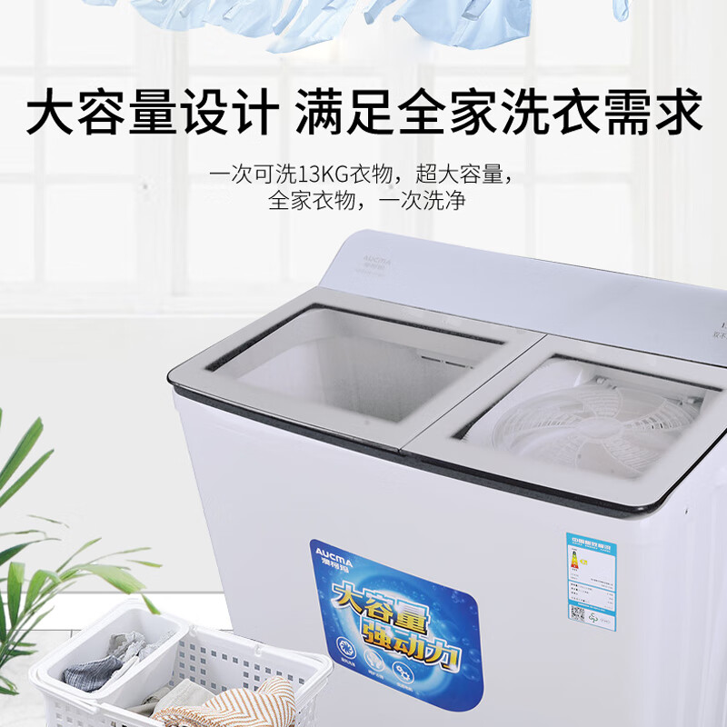 澳柯玛(AUCMA)13公斤半自动洗衣机 玻璃面板大容量双缸双桶波轮 宿舍租房家用 洗脱分离甩干机 XPB130-3188S价格:659.00元!