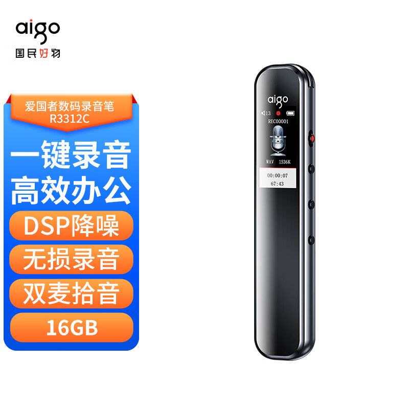 爱国者 aigo录音笔R3312C 16G一键录音专业普及型高清降噪 学习培训商务会议采访 录音器 MP3播放 灰色价格:139.00元!
