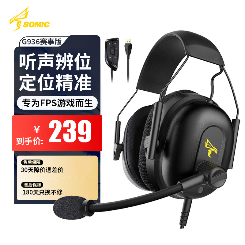 硕美科(SOMIC)G936赛事版游戏耳机电竞FPS降噪耳麦CSGO吃鸡听声辩位 黑色7.1版价格:239.00元!