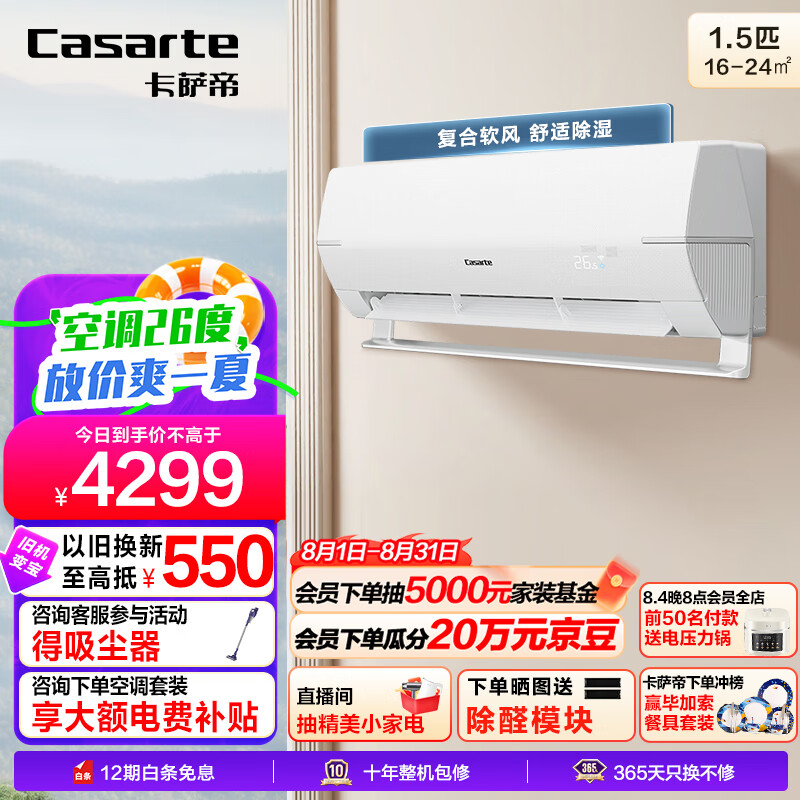 卡萨帝(Casarte)1.5匹 星云 复合软风 舒适除湿 壁挂式空调挂机 一级能效 智能变频 卧室 CAS3516BAC(81)U1价格:4299.00元!