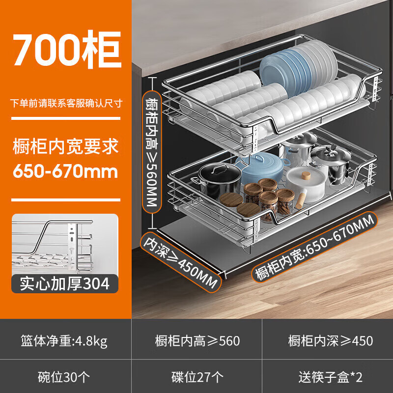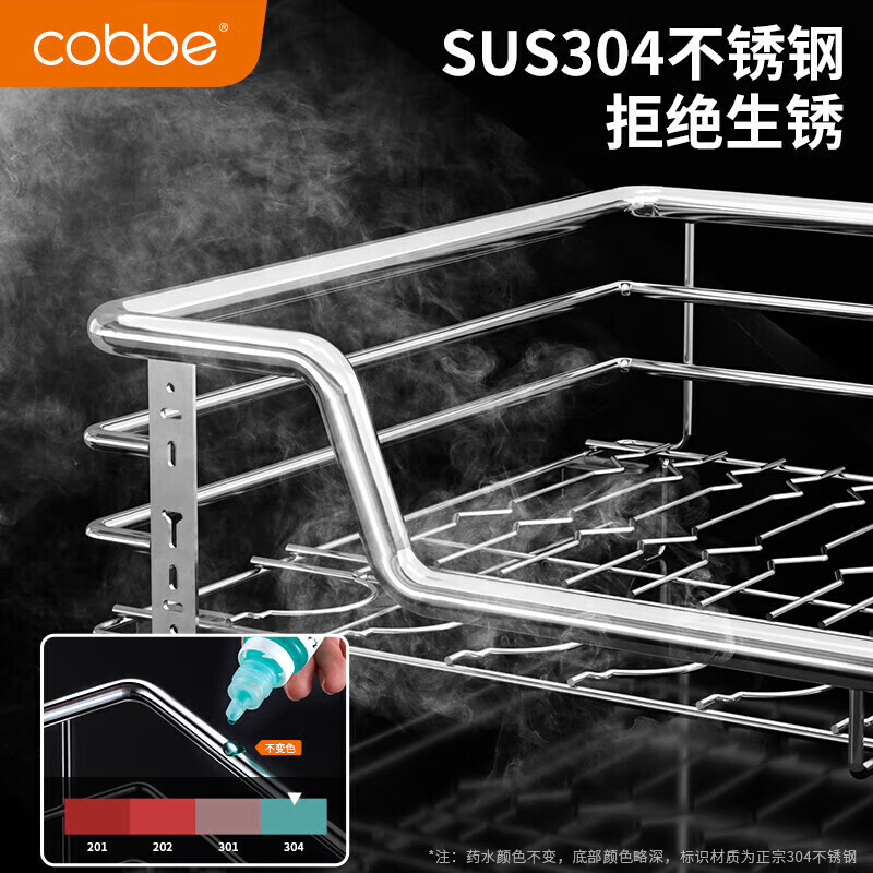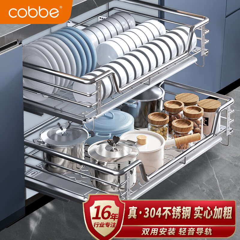 卡贝(cobbe)厨房拉篮橱柜304不锈钢碗架抽屉式双层碗篮置物架调味拉蓝碗碟架价格:448.00元!