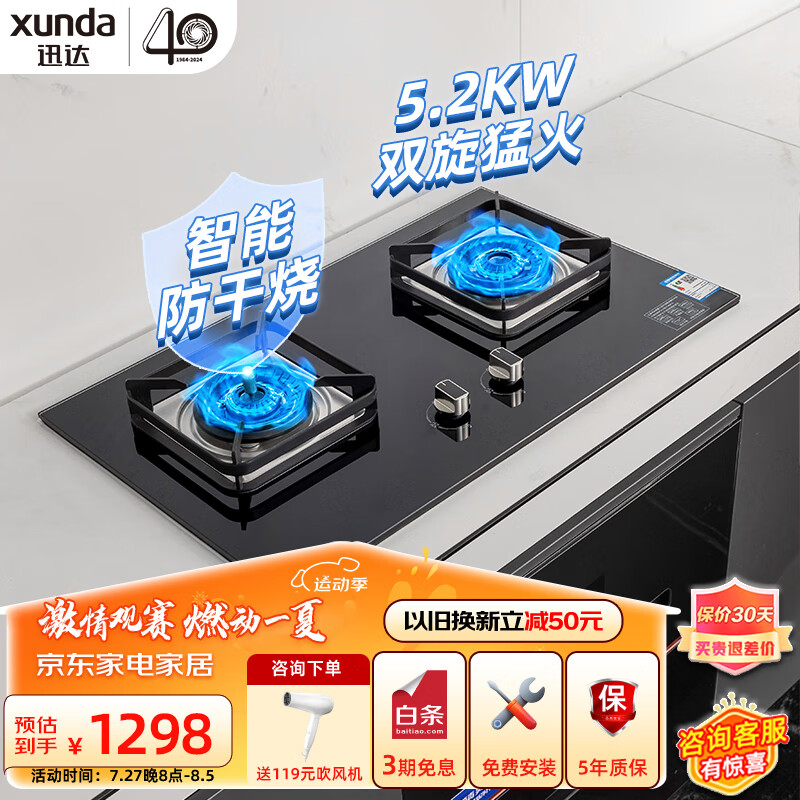 迅达(XUNDA)燃气灶天然气灶家用 双灶具灶台 嵌入式台式两用 5.2KW旋流猛火灶 防干烧保护 MG1-天然气价格:1498.00元!