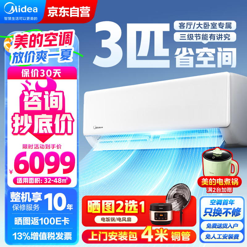 美的(Midea)3匹 空调挂机 新三级能效 变频冷暖 节省空间 空调3匹 挂式空调 美的空调 KFR-72GW/G1-3价格:6099.00元!