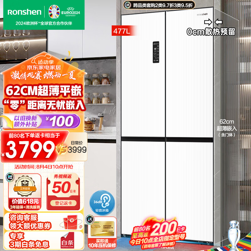 容声(Ronshen)蓝光养鲜零嵌477升十字对开四开多门超薄嵌入式电冰箱家用一级大容量底部散热BCD-477WD3FPLA白色价格:4399.00元!