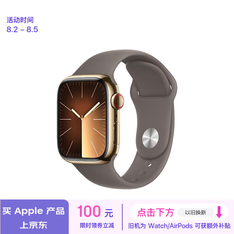 Apple/苹果 Watch Series 9 智能手表GPS+蜂窝款41毫米金色不锈钢表壳陶土色运动型表带S/M MRJW3CH/A价格:5799.00元!