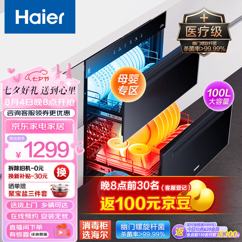 海尔(Haier)消毒柜 家用嵌入式 消毒碗柜 100L上下双层 大容量 光波巴氏消毒 不锈钢 碗柜 母婴童锁EB03价格:1299.00元!