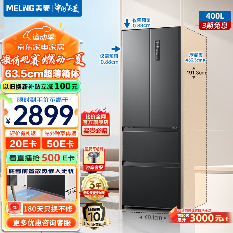 美菱(MeiLing)冰箱400升法式双开门冰箱对开门家用一级能效零嵌入式超薄601mm窄箱体风冷无霜底部散热四门电冰箱 【无忧嵌】 BCD-400WP9CZX-灰价格:3099.00元!