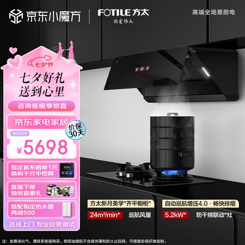 方太新月抽吸油烟机灶具套装 侧吸式变频烟灶24巡航风量烟灶联动挥手5.2kW*防干烧换装灶F1A+THK21B价格:5698.00元!