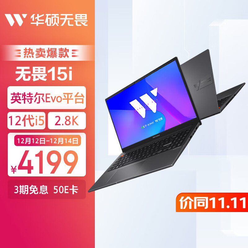 华硕无畏15i 英特尔Evo平台 15.6英寸2.8K 120Hz OLED轻薄高性能笔记本电脑(12代标压i5-12500H 16G 512G)黑价格:4199.00元!