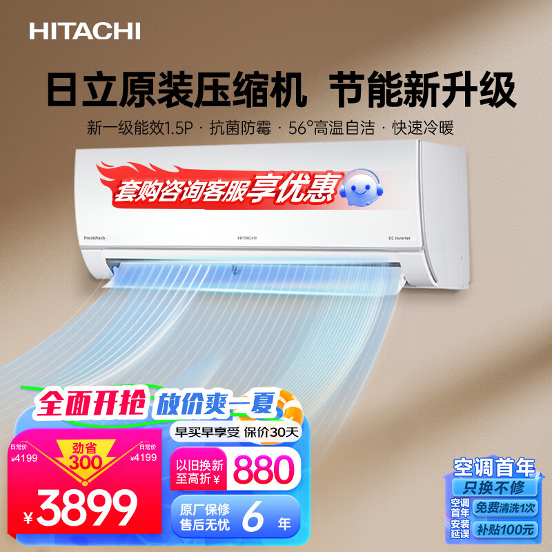 日立(HITACHI)白熊君升级日立原装压缩机 新1级能效1.5匹变频空调挂机节能健康除菌以旧换新RAK/C-DE12PHCPC价格:3899.00元!