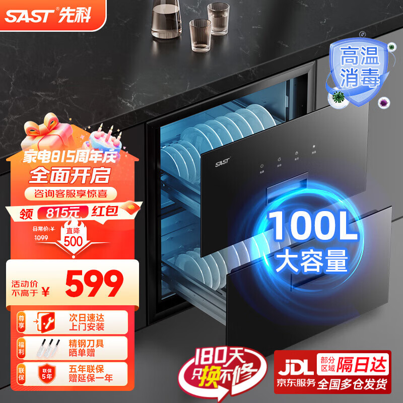 先科(SAST)消毒碗柜嵌入式家用厨房小型保洁柜三层双层大容量婴儿奶瓶餐具碗筷 100L /4键两层/高温消毒价格:1099.00元!