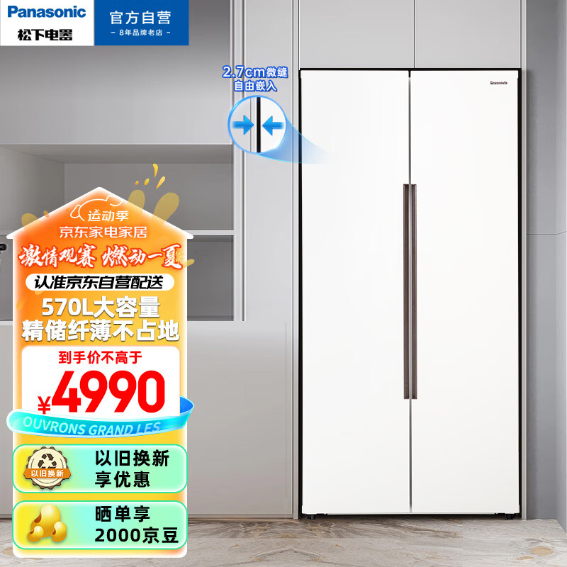 松下(Panasonic)570升家用对开门冰箱 自由嵌入式 超薄大容量双开门 冷冻王冰箱 磨砂白色NR-JB57WPA-W价格:4990.00元!