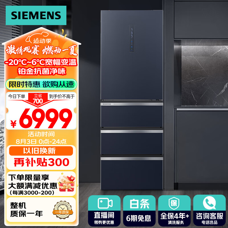 西门子(SIEMENS)406升灵动储鲜宽幅变温铂金抗菌净味晶御智能一级能效大容量多门冰箱湖蕴蓝以旧换新KG405951VC价格:7199.00元!