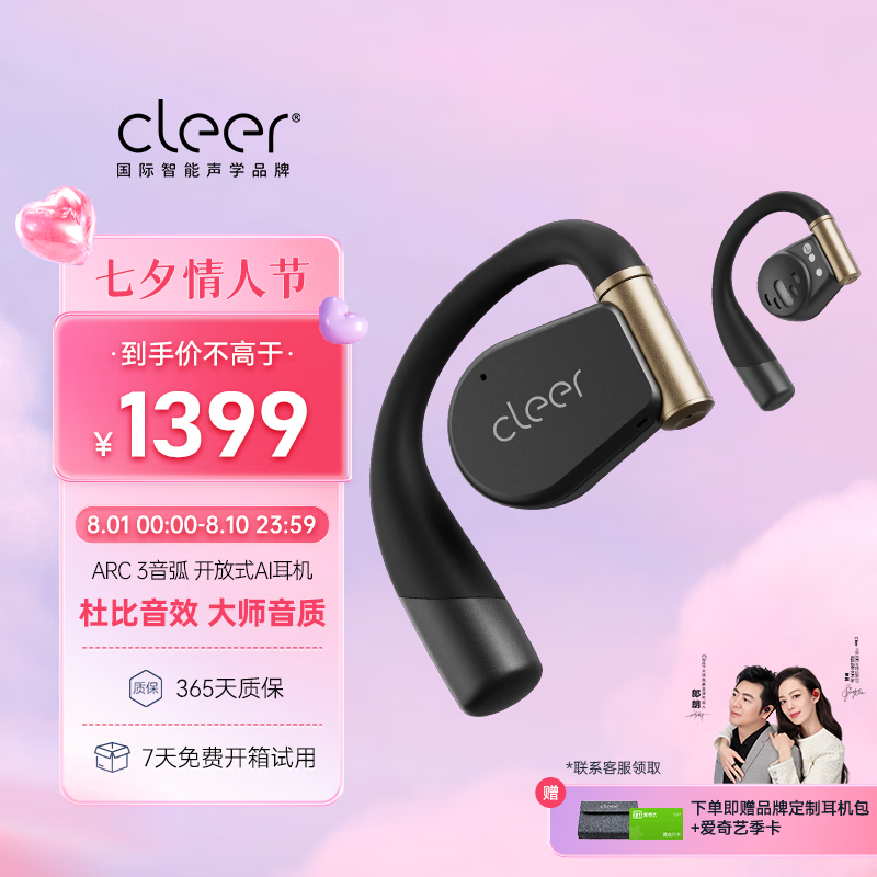 cleer郎朗推荐七夕礼物ARC3代不入耳开放式杜比空间音频AI智能无线蓝牙运动耳机挂耳式骨传导升级恒星黑价格:1399.00元!