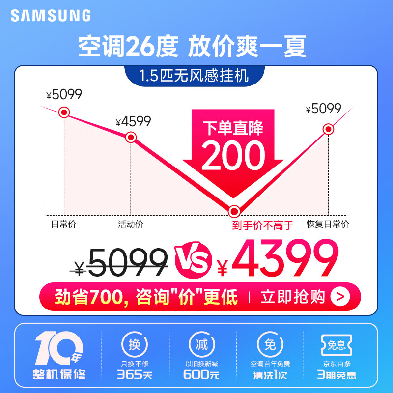 三星空调1.5匹新二级能效全直流变频无风感WIFI除菌冷暖壁挂式挂机20-25㎡适用以旧换新AR12TSCAAWKNSC价格:4399.00元!