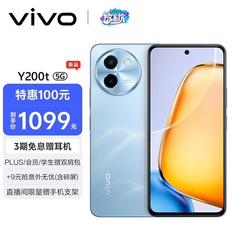 vivo Y200t 8GB+128GB 晴山 44W 6000mAh 120Hz金刚护眼屏 双扬300%大音量 5G 拍照 手机价格:1199.00元!