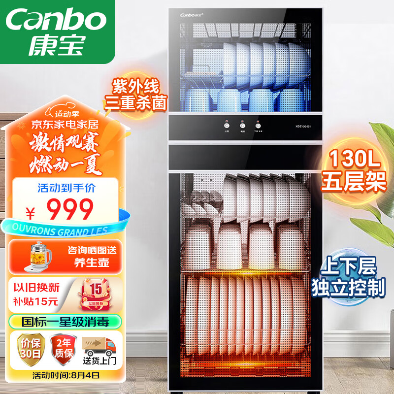康宝(Canbo)消毒柜家用立式不锈钢大容量商用面馆小型130L家庭餐具紫外线双门二碗筷消毒碗柜XDZ130-D1价格:999.00元!