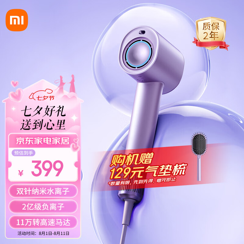 米家【七夕情人节礼物】小米高速水离子吹风机H701 家用大风力 大功率速干降噪 双水离子护发 星钻紫价格:399.00元!