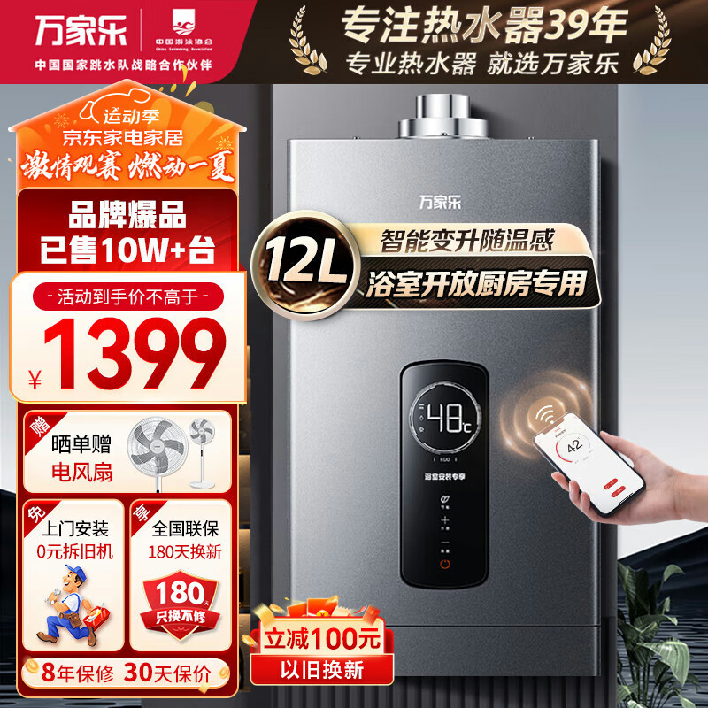 万家乐平衡式恒温燃气热水器天然气12升RH2 浴室安装专用 智能变升 四季免调温WIFI远控8秒出热水ECO节能价格:1399.00元!