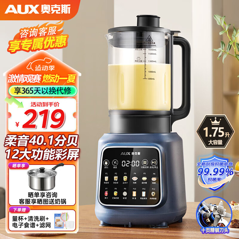 奥克斯(AUX)轻音破壁机家用豆浆机多功能榨汁机全自动加热破壁料理机1.65升预约早餐机APB-08APPB03价格:219.00元!