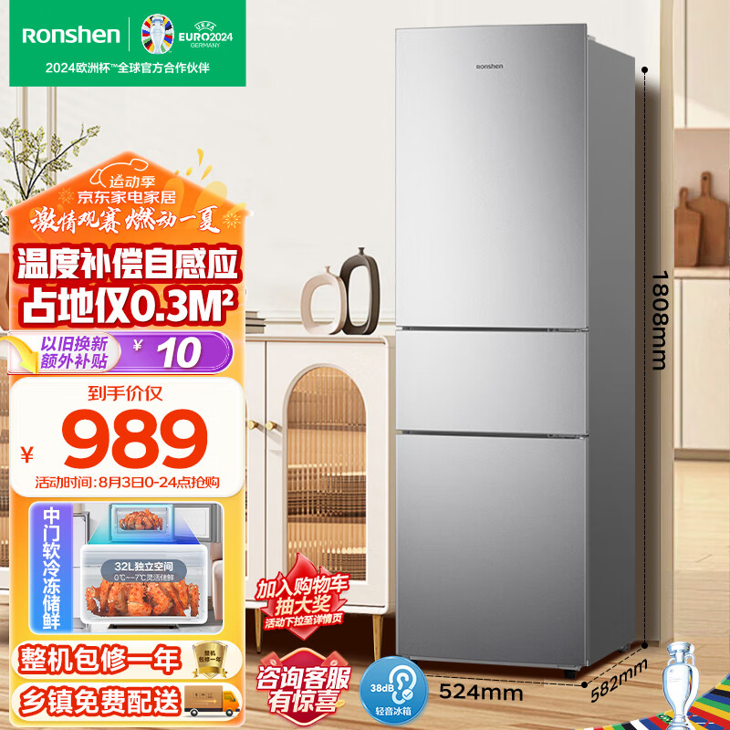 容声(Ronshen)218升三门小型电冰箱银色中门软冷冻三温区保鲜节能省电低噪家用出租房宿舍小巧不占地BCD-218D11N价格:989.00元!