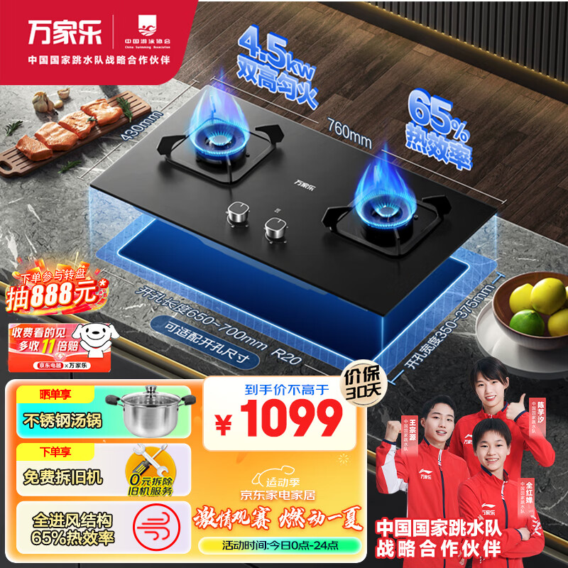 万家乐燃气灶4.5kw大火力 家用嵌入式煤气灶双灶台嵌两用双灶烟灶联动全进风可调节开孔JZY-KV063B液化气价格:1199.00元!