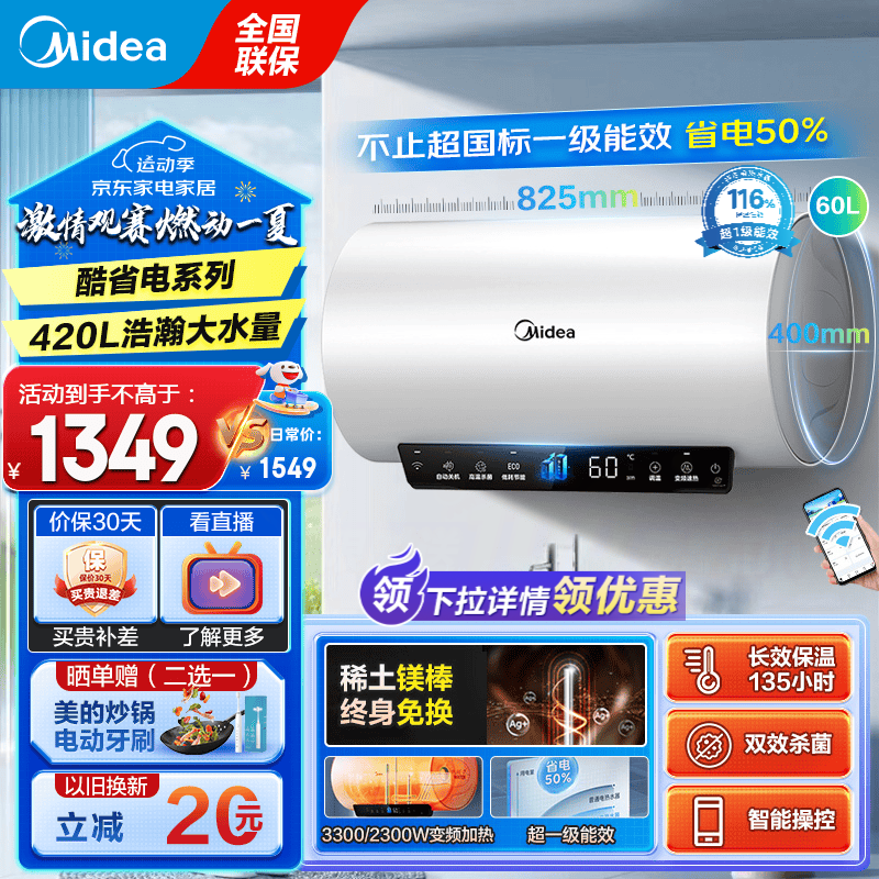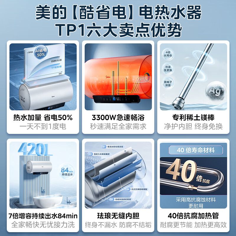 美的(Midea)储水式电热水器家用 酷省电新一级能效 3300W变频速热 终身免换镁棒 APP智控小型速热TP系列热水器 60L 3300W TP1【酷省电1天不到1度电】价格:1549.00元!