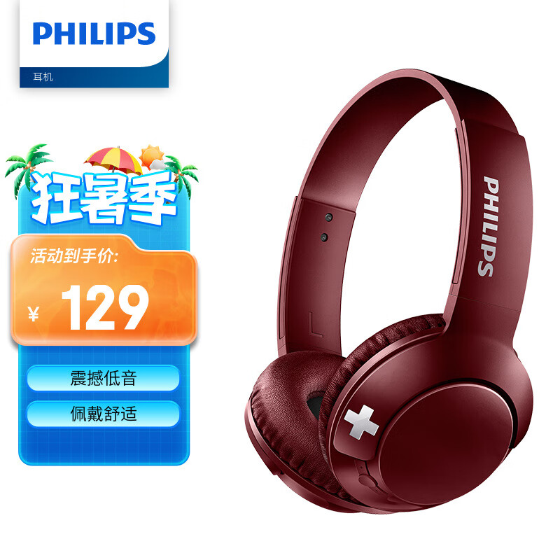 飞利浦(PHILIPS)头戴式耳机蓝牙音乐耳机 电脑耳麦 Bass+重低音耳机苹果华为小米安卓手机通用SHB3075红价格:129.00元!