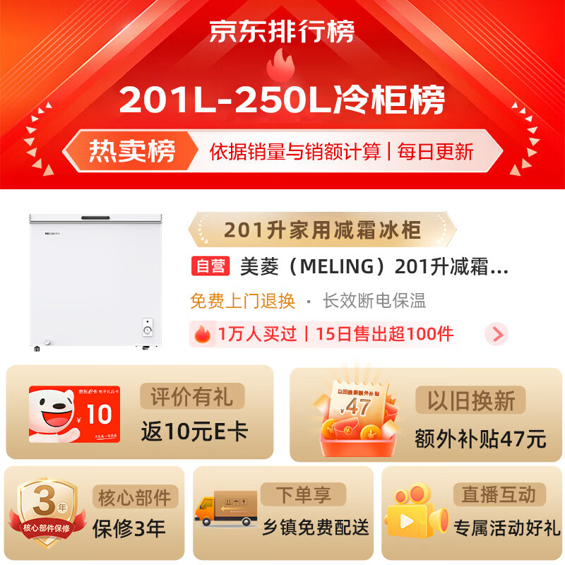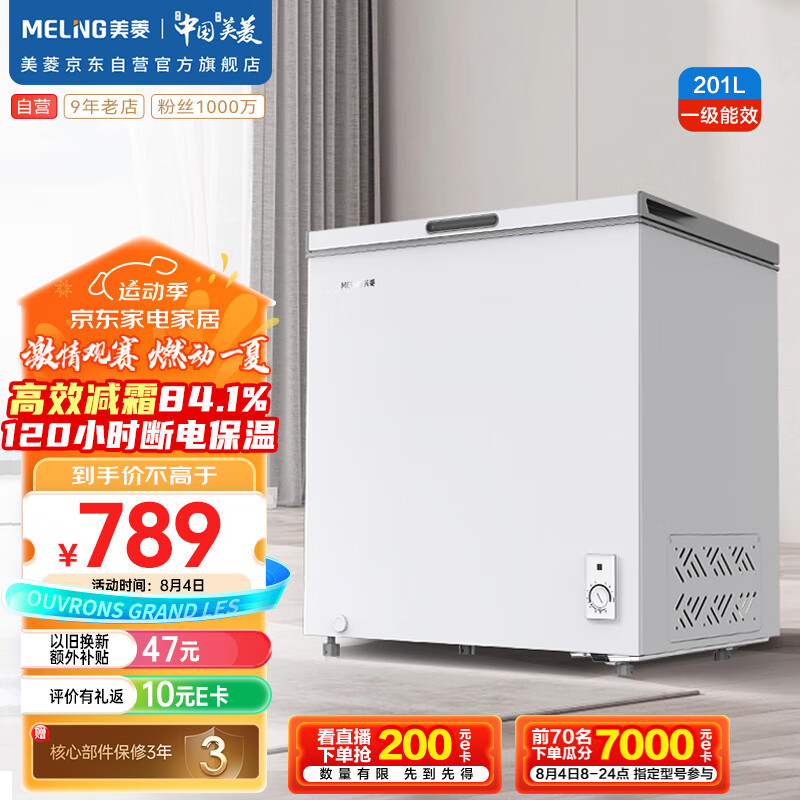美菱(MeiLing)201升减霜家用商用冰柜冷藏冷冻转换单温冷柜-35°速冻一级能效卧式小冰箱BC/BD-201DT白以旧换新价格:743.00元!