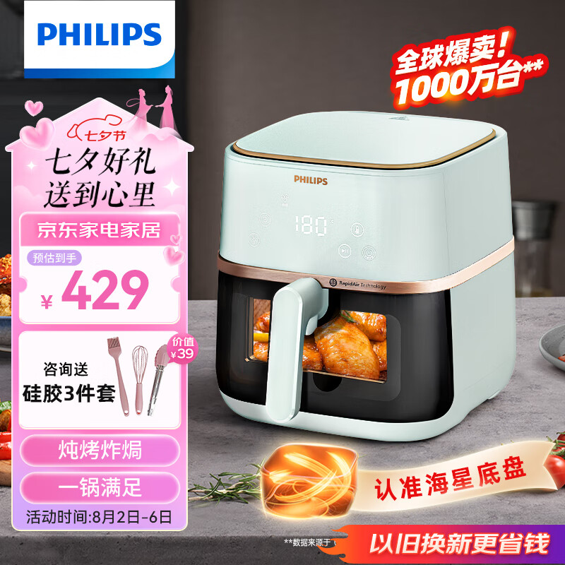 飞利浦(PHILIPS)空气炸锅家用5L大容量 可视 不用翻面 智能液晶触控 宽温域多功能电炸锅HD9455价格:429.00元!