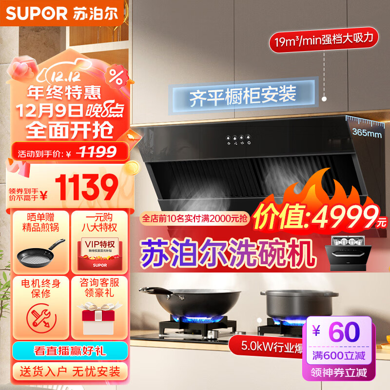 苏泊尔(SUPOR)抽油烟机燃气灶套装 家用小尺寸大吸力 19立方侧吸式小户型烟灶套装 DJ13S+Q5天然气价格:1199.00元!