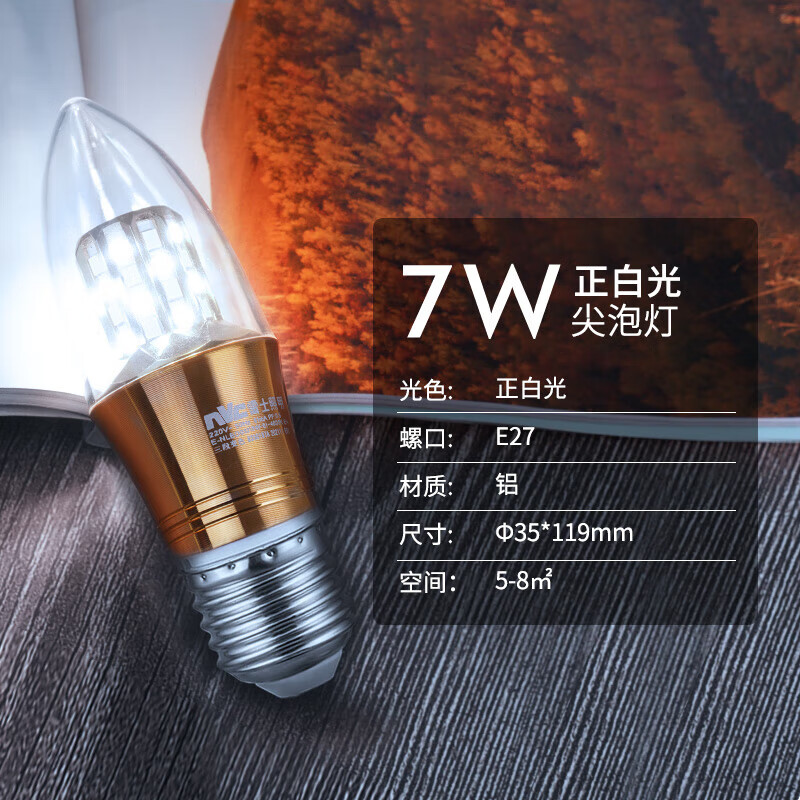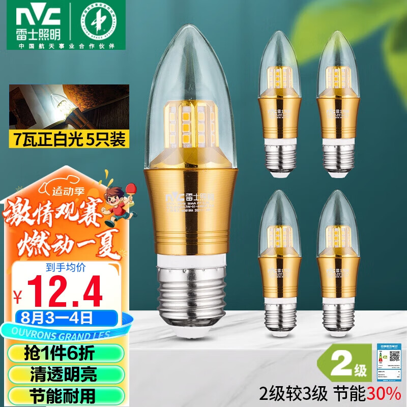 雷士(NVC) LED灯泡尖泡 7瓦E27大螺口 光源节能灯 正白光6500k(5只装)价格:103.00元!