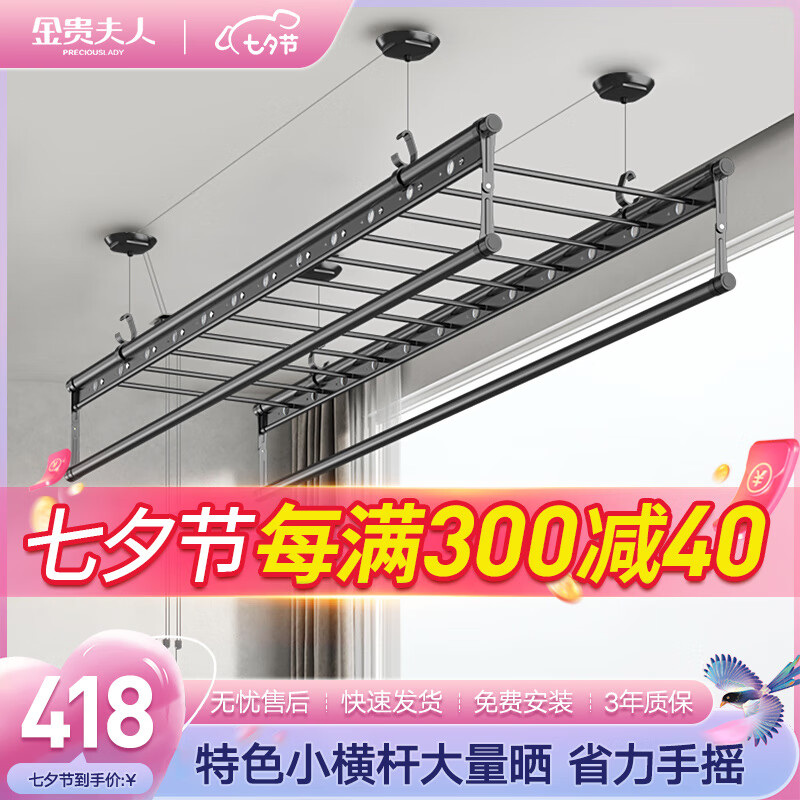金贵夫人升降晾衣架阳台手摇晾衣杆四杆室内折叠晒衣架凉 2.7米+10个衣架价格:458.00元!