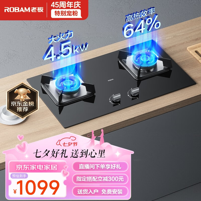 老板(Robam)家用燃气灶 4.5kW天然气灶双灶具灶台 一级能效 钢化玻璃煤气灶台嵌两用小尺寸猛火灶JZT-32B7D价格:1069.00元!