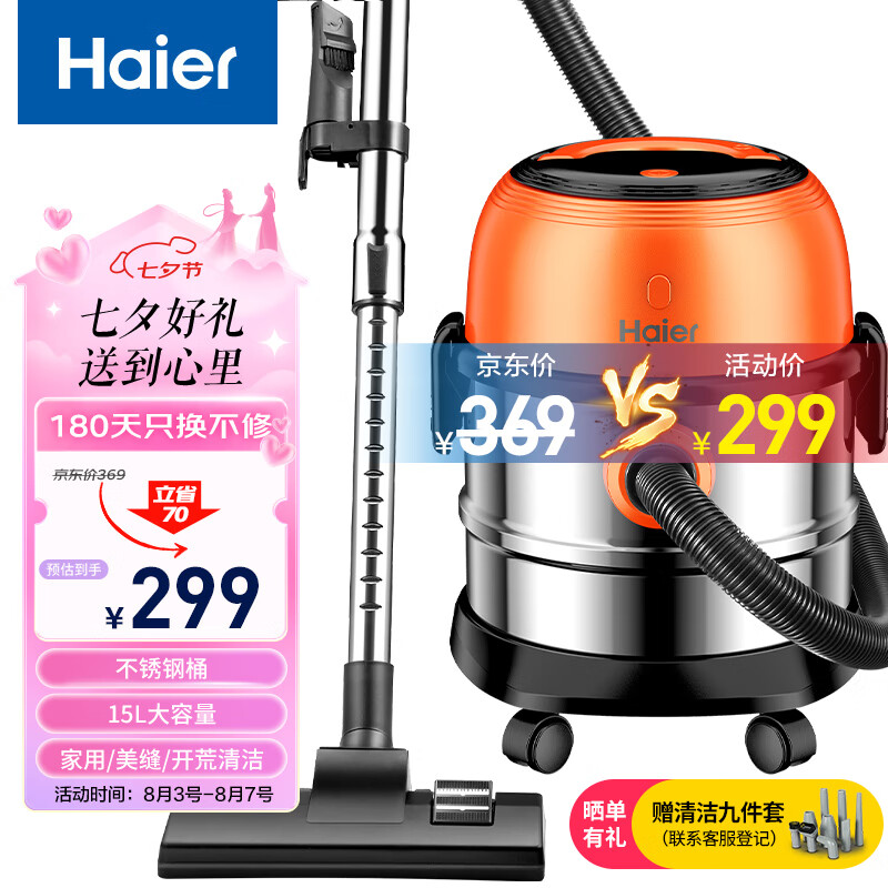 海尔(Haier)桶式吸尘器家用 不锈钢15L大容量 干湿吹三用大功率大吸力商用吸尘机HZ-T715价格:298.00元!