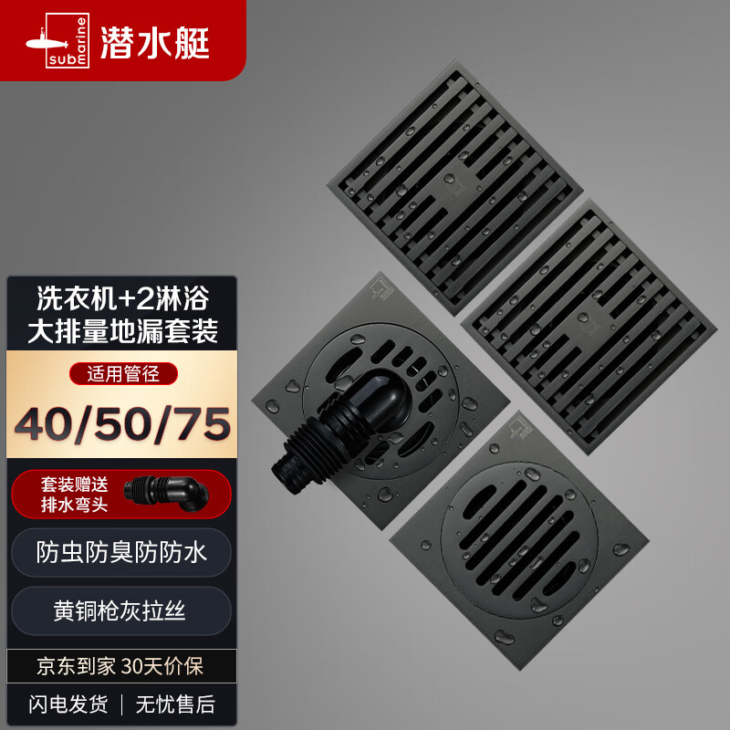 潜水艇(Submarine)黄铜枪灰色防臭地漏套装40管移位2个大排量淋浴+干湿区+洗衣机价格:462.00元!