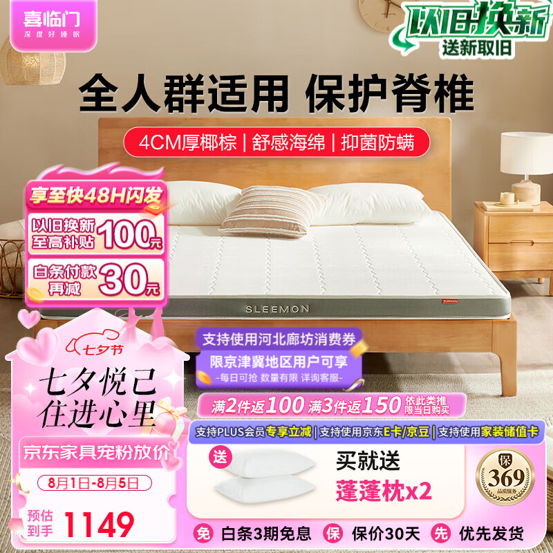 喜临门椰棕薄垫子 4CM舒脊椰棕偏硬席梦思儿童老人床垫 伊菲H6 1.8x2米价格:1149.00元!