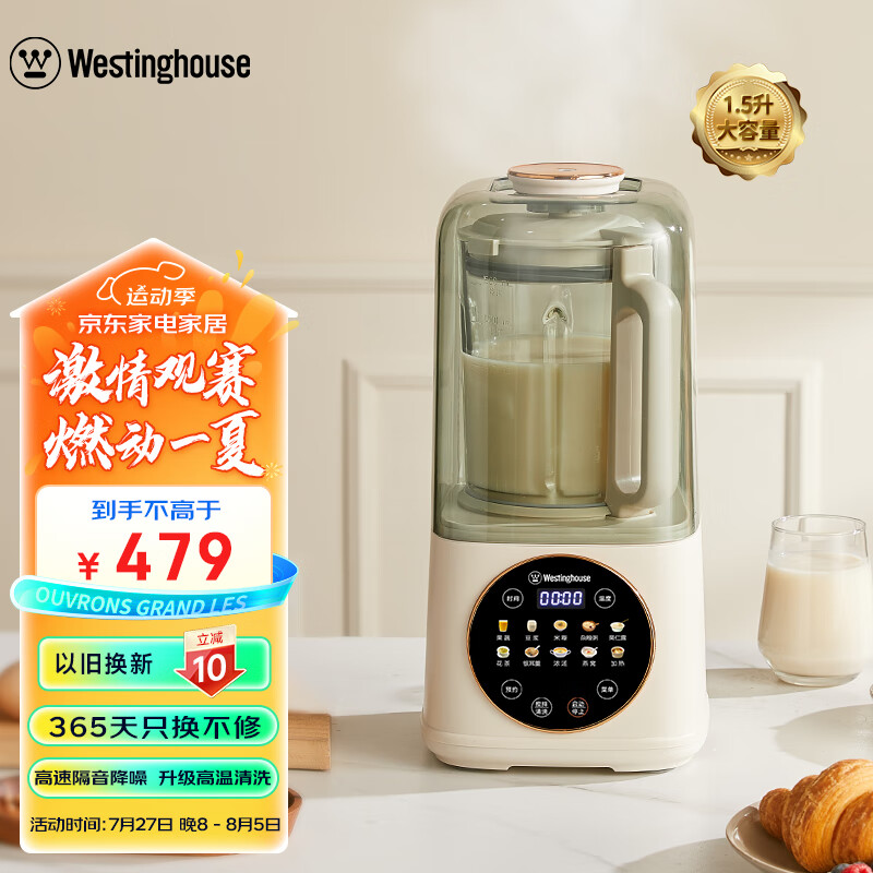 西屋(Westinghouse)柔音破壁机家用豆浆机加热全自动榨汁机搅拌机降噪辅食机 WPB15J7杏仁白(单杯款)价格:479.00元!