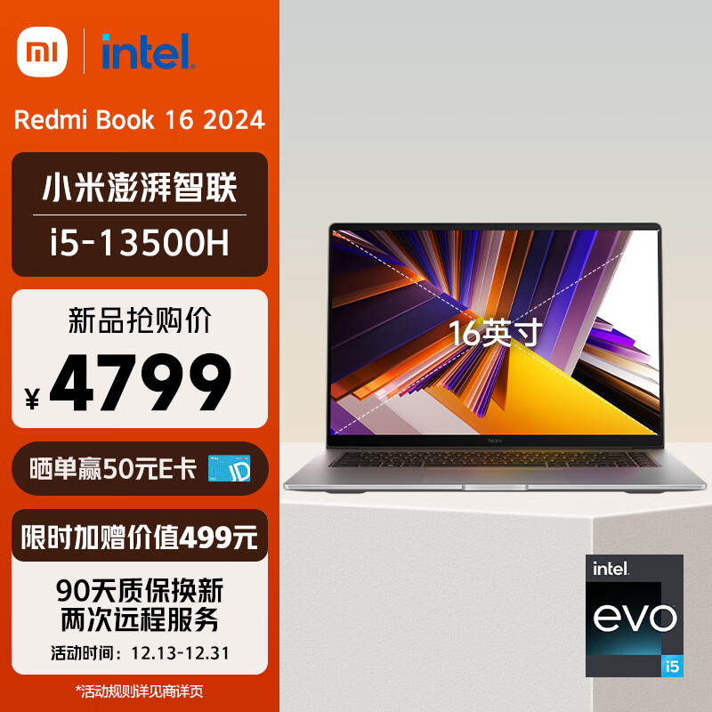 小米笔记本电脑 红米 Redmi Book 16 2024 13代酷睿i5-13500H 2.5K-120hz高刷屏 轻薄本(i5 16G 1T office)价格:4799.00元!