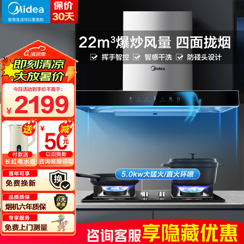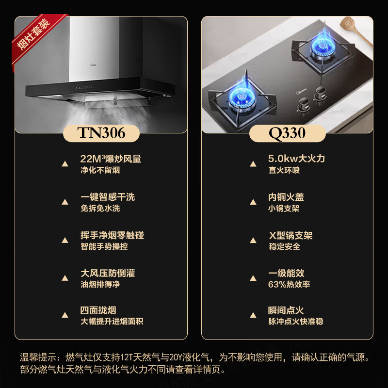 美的(Midea)欧式顶吸抽油烟机家用 22立方大吸力油烟机燃气灶具两件烟灶套装 厨房电器液化气TN306+Q330价格:2199.00元!