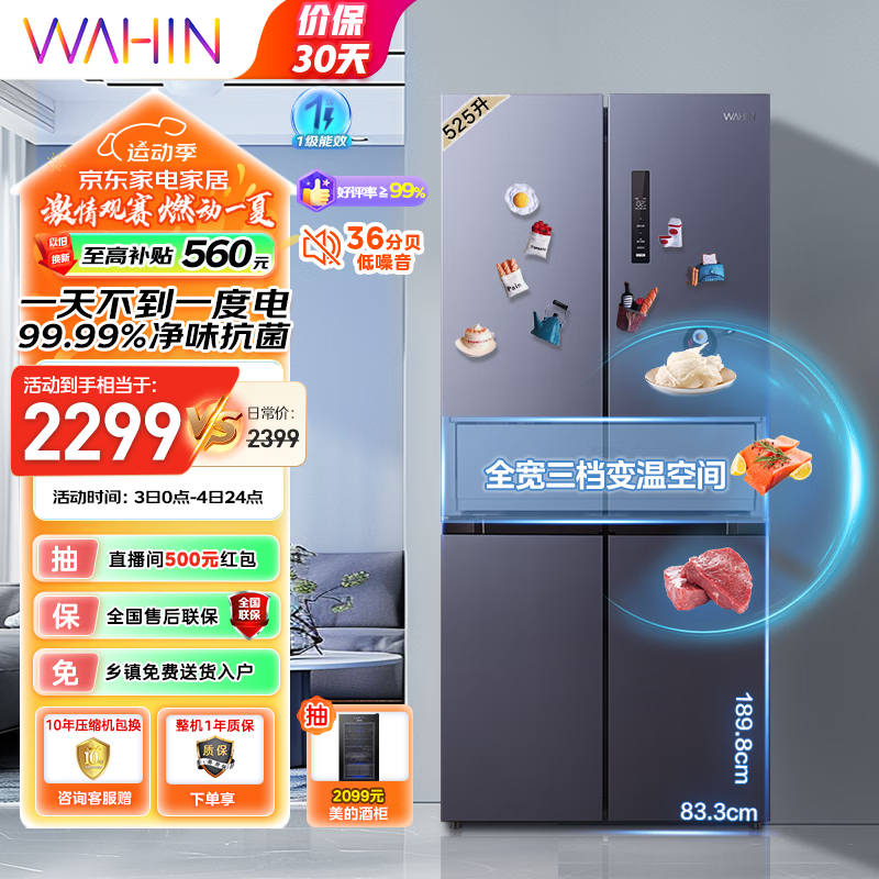 华凌 美的冰箱出品551十字对开冰箱一级能效双变频风冷无霜PT净味多门大容量囤货家用HR-551WSP价格:2299.00元!