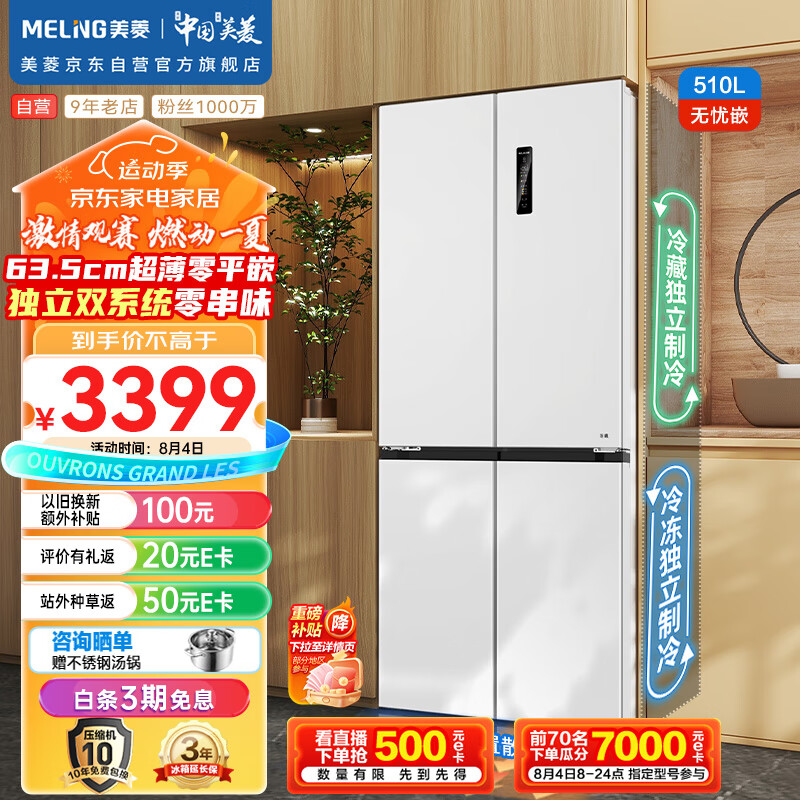 美菱(MeiLing)510升十字双开对开四开门超薄零嵌入式冰箱【李佳琦直播升级款】双系统双循环BCD-510WP9CZX白色价格:3699.00元!